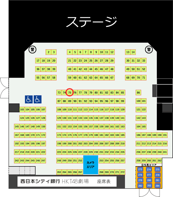 15分前に劇場ロビーへ着くと、やけに閑散としています。中へ入って愕然、なんとスタンド3列目くらいまでしか人がいません。そんな訳で今日の席はこちら!この席の通知が来た時は喜んだけど、おそらく1次募集は100人前後だったのでしょう、それならあまり良くないクジ運は下位グループ。